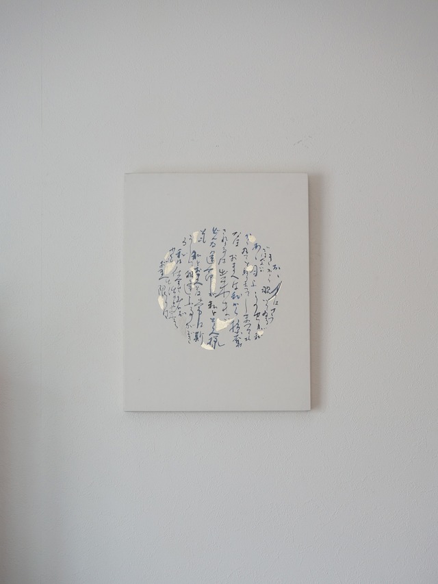 size/ F6 318×410㎜ material/ 画仙紙、墨、金箔、温泉、胡粉 *七日一巡り 欅の間 展示作品 5.6二つセットで55000円 ========================== 〈釈文〉 柳原白蓮『指鬘外道』序より 神様! お礼を申します 悲哀ある所 これ聖地 涙の流るヽ日は これ聖日 と 斯う 私はいつかあなたから 教わりました それ故に 今 このように 身も 魂も 唯一人の むき出しの 私が 涙ながらに 感謝の祈りを 捧げて居ります という口の下から けれども 神様! 私の本当の願いはそうではなかったのです ====================== のちに二度と来ないと歌った別府の地で 山を見、海を見、温泉に浸かってあの頃彼女は何を感じていたのか? 約100年前、彼女が見た景色を、私も今見ている。 彼女の三十一文字、6㎝×36㎝の短冊の世界は、 まるで火と水と大地のめぐりによって噴出する温泉のよう。 このような人が生き抜いた事実も含めすべてがこの世の恵みであり、 希望である。(人はいつの時代も表現者の勇気に救われてきた) * 大正9年発刊の戯曲『指鬘外道』の序文もまた、 白蓮34歳の頃にこの別府の地で書いた文章である。 燃え上がる炎のような創造性と、 それを自ら水に流して亡きものにしてしまおうという思いとを行き来しながら 日々の苦悩を美しく謳い上げた珠玉の文章だ。 その混沌に差す光は、 時間や空間を越えて幾重にも重なって層を成し、 確かな手触りとなって、今、私の目の前に現れる。 * 本作では、その質感とエネルギーの総体として、別府温泉のスケール(温泉成分が固形化し堆積物となったもの)を用いて表現した。白いスケールは青い湯が美しい別府市小倉にある“別府 おぐら”衛藤直子様にご協力、ご提供いただいた。